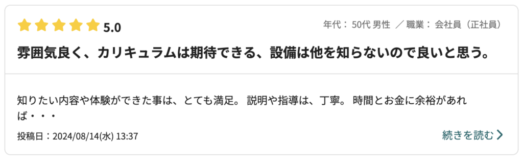 スクールの設備や機材はもちろん、インストラクターさんも穏やかな方が多く、初学者でしたが自信を持って進めることができ、大変満足しています。 日光での試験では、追加料金なしでご飯をご馳走いただいたり温泉に連れて行っていただいたりと、スクールに通った経験がとても良い思い出になりました。20代男性/学生