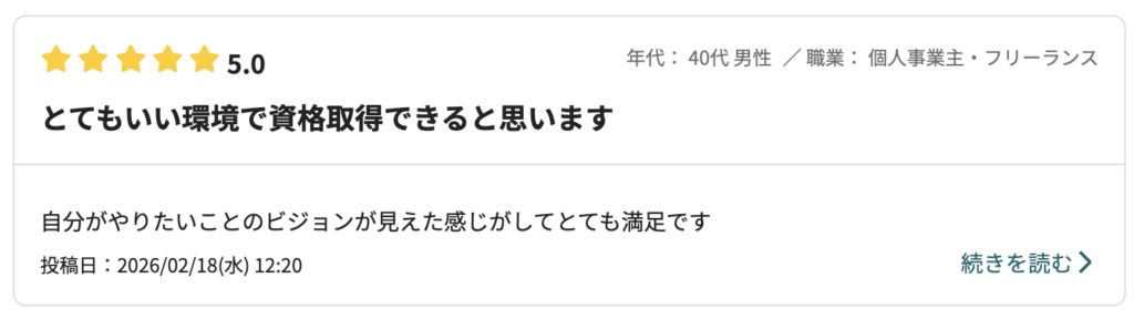 ドローンの資格取得に対して、ドローンの飛ばし方だけでなく実際に仕事で使う時には何が必要か、仕事の中でどう活かしていく事が出来るかなど個人に寄り添って様々な角度からアドバイスをもらえて資格取得後のプランもより具体的にイメージする事が出来ました。実際の仕事での活用方法などの話が聞けたのはありがたかったです。30代男性/会社員